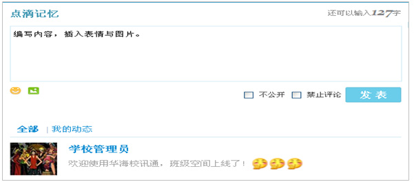 在首页或随笔页面将内容填写进“点滴记录”框内,点击发表就可以分享学生在校的点滴了。每次插入的图片都会自动保存到相册中的“我的配图”目录下。学生也可对你的分享进行评论。