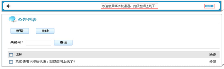 点击首页公告栏中的文字或是more,进入公告编辑列表页面,教师可修改添加公告。公告只显示最新的一条。