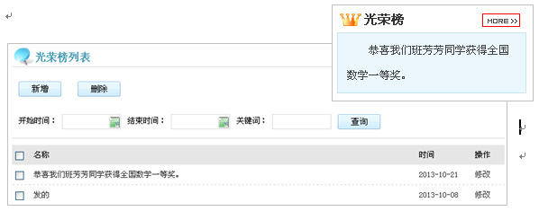 点击首页光荣榜中的more,进入光荣榜编辑列表页面,教师可修改添加光荣榜。