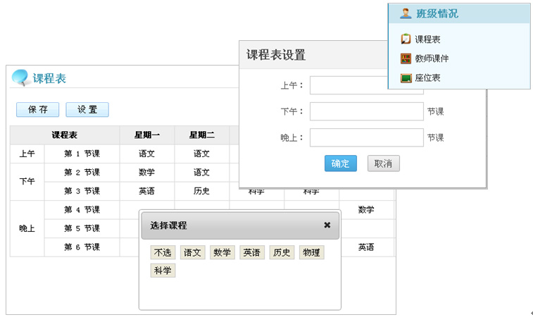 点击首页下班级情况中的课程表,进入课程表编辑页面,教师或指定的学生可以设置课程表。如有课程缺少,您可以联系学校管理员或客服人员增加学校课程。