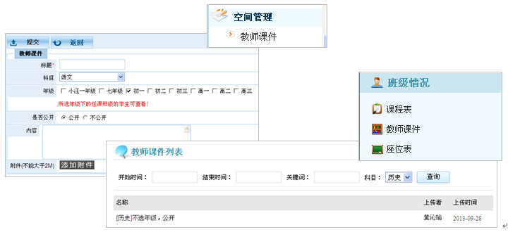 进入班级空间首页下班级情况中的教师课件,进入教师课件下载列表页面,可下载所有老师提供给本年级的课件。