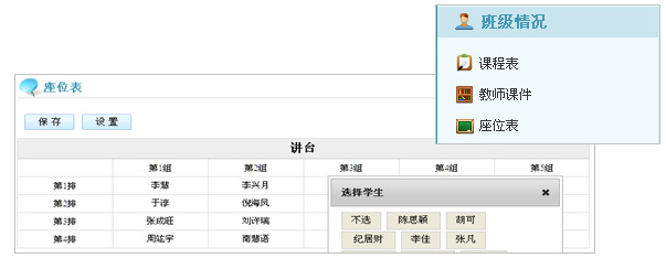 点击首页下班级情况中的座位表,进入座位表编辑查看页面,教师或指定的学生可以设置座位表。如学生名单就是华海智慧校园里的学生信息,如有误您可以自己在校讯通学生信息处修改或客服人员增加或删除学生。
